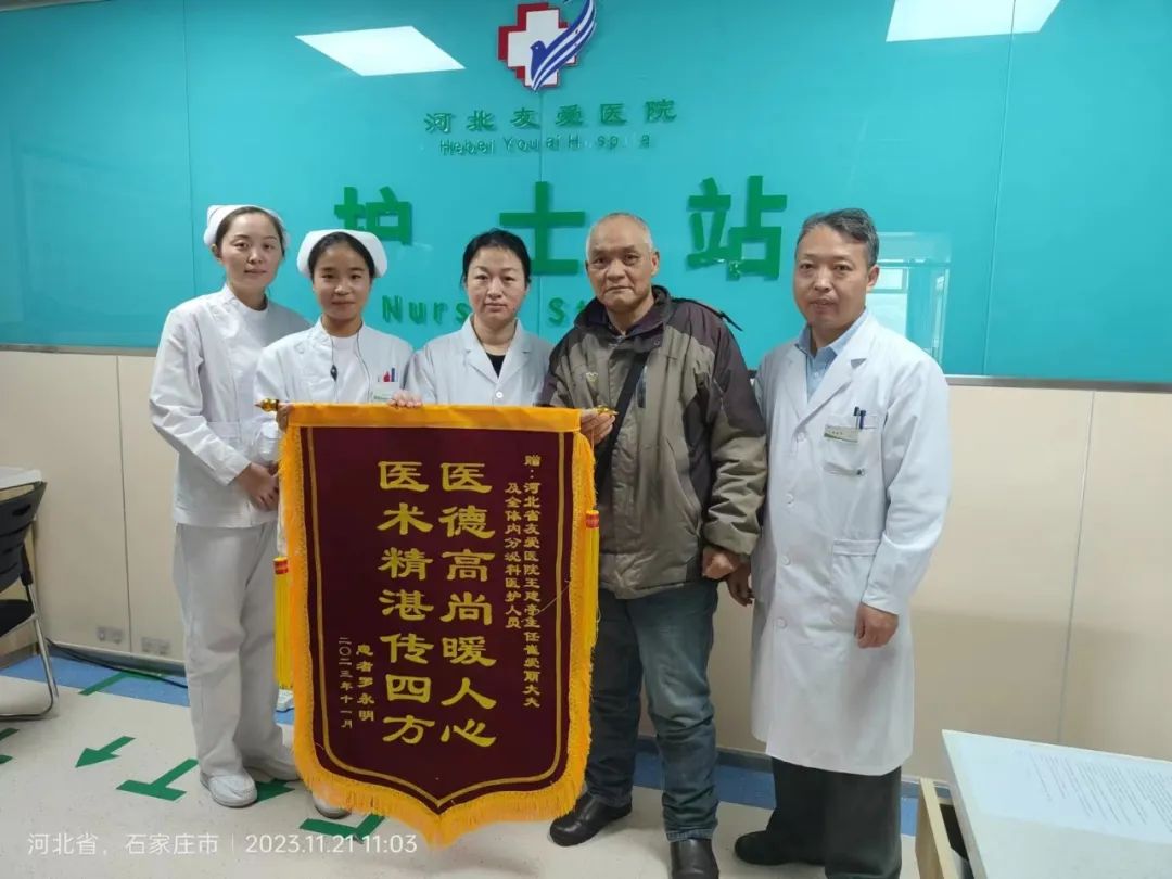 无独有偶,11月21日上午,曾在内分泌科住院的罗先生,也将锦旗送到内分泌科,对内分泌科全体医护人员表示感谢,据了解罗先生在10月因尿毒症引起周身瘙痒,于内分泌科住院接受治疗,罗先生表示:在住院期间,医护人员们对他给予了亲人般的关怀,用专业的技术帮助他摆脱了病痛的